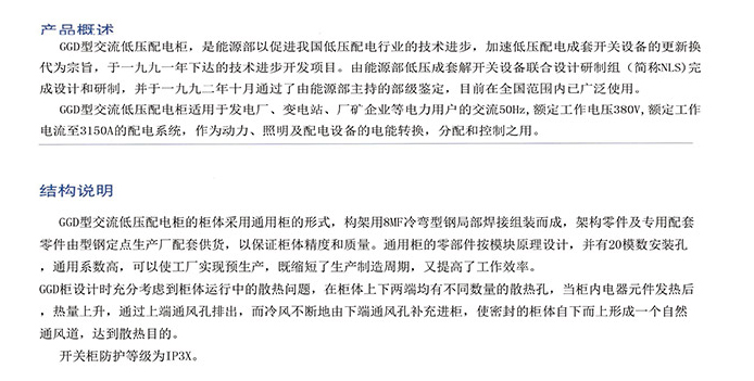 GGD型交流低压配电柜适用于发电厂、变电所、厂矿企业等电力用户的交流50Hz,额定电压380V,额定电流至3150A的配电系统中,作为动力,照明及配电设备的电能转换、分配、控制之用。GGD交流低压配电柜是本着安全、经济、合理、可靠的原则设计的新型低压配电柜。产品具有分断能力高,动热稳定性好,电气方案灵活、组合方便,系列性、实用性强,结构新颖、防护等级高等特点。可作为低压成套开关设备的更新换代产品使用。GGD型交流低压配电柜符合IEC439《低压成套开关设备和控制设备》,GB7251《低压成套开关设备》等标准。